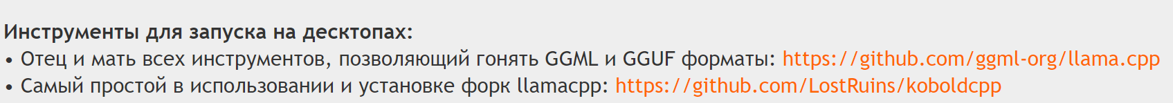 • Отец и мать всех инструментов, позволяющий гонять GGML и GGUF форматы: https://github.com/ggml-org/llama.cpp