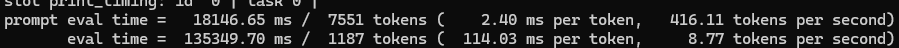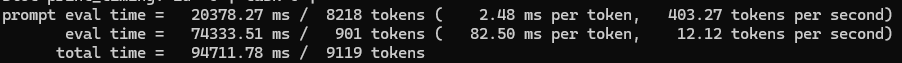>>1553483 Вот Qwen_Qwen3.5-9B-Q4_K_M -ngl 0 -t 12 -с 64000 Кстати да совет говна был про ядра равные физическим, у меня у самого 12 потоков стоит в батнике. prompt eval time = 8482.36 ms / 1114 tokens ( 7.61 ms per token, 131.33 tokens per second) eval time = 177503.80 ms / 1214 tokens ( 146.21 ms per token, 6.84 tokens per second) total time = 185986.16 ms / 2328 tokens
