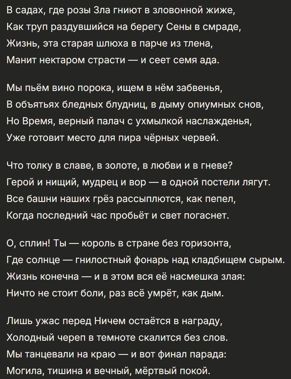 2 пик — барабанная дробь — грок 4.2 с 4 агентами, каждый из которых пыхтел несколько минут, чтобы высрать этот опус, сделав его идеальным Нет, дело не в агентах и не в бете. 4.1, 4.0, ризонинг, любой режим выдаёт такое дерьмо. А там модель точно на триллион. Грок 3 мог нормально, но его удалили.