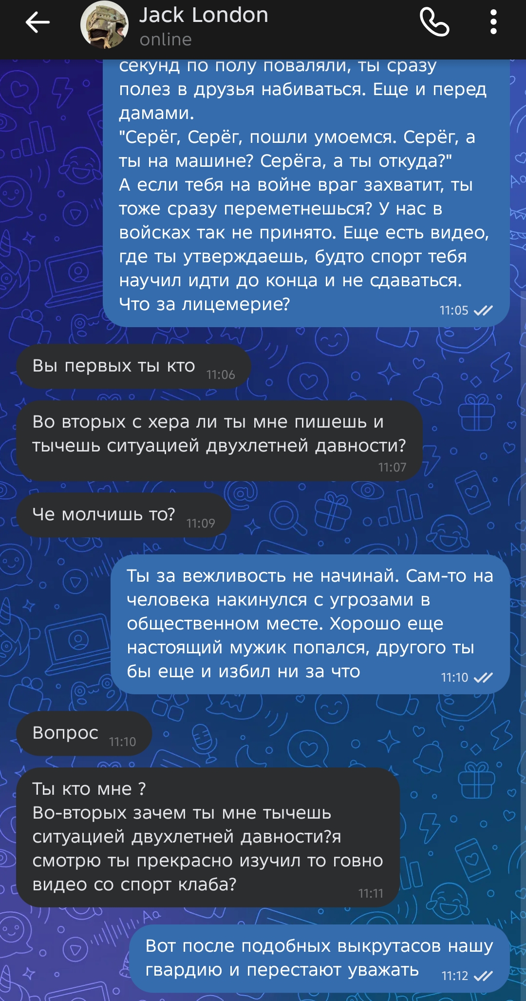 А Серёга реально мужик крутой. Даже не оскорбил его ни разу как следует, по делу говорил. Я прям кумира себе нашел. Для него это вообще не конфликт, а детская хуйня. Просто на раз два рыцарем вышел из потасовки и не боялся, что равилька снова быканет
