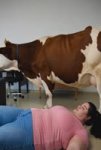 "девушка подходит к корове , ложится на спину, корова поворачивается спиной, от коровы падает густой навоз на нее, она улыбается, она вся мокрая и грязна."