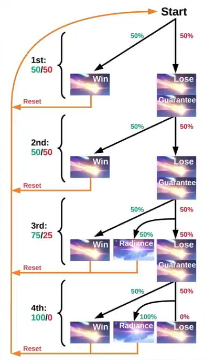 Напомните как сияние работает а то мы спорили в одном месте Гарант сияния после трёх проигыгрышей или четырех? Шанс повышается 25/50/75/100 или 3 раза 55% а потом 100%? Некоторые уникумы ещё утверждали что при сиянии стандарт лега падает.