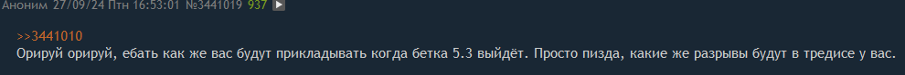 Год назад где-то было, не ебу. Смысл не в конкретных постах, а в том, что в ответ на любой пост вне зависимости от его содержания и наполнения, любители Мявки только и делают, что пукают однотипной репликой. Это как с маленьким ребёнком разговаривать. Вредным обкакуленным маленьким ребёнком. Пример есть итт: первые два ответа на 877 пост
