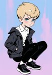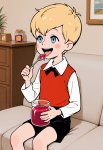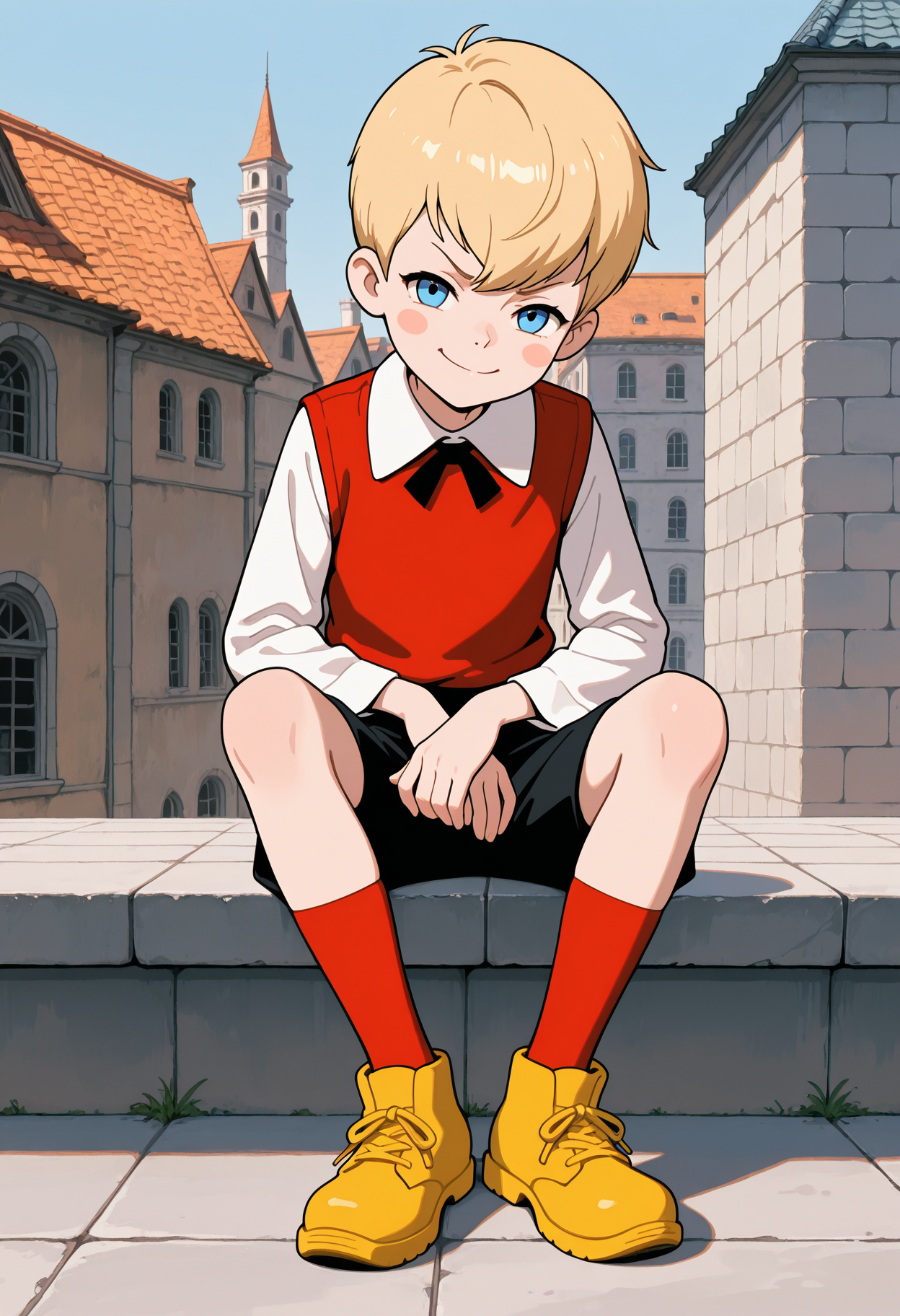 Ключевое слово: Malysh (я думаю можно и без него), рекомендуемые тэги: 1boy, male focus, blush stickers, blond hair, blue eyes, short hair, red vest, white shirt, black neck ribbon, black shorts, yellow shoes, red socks