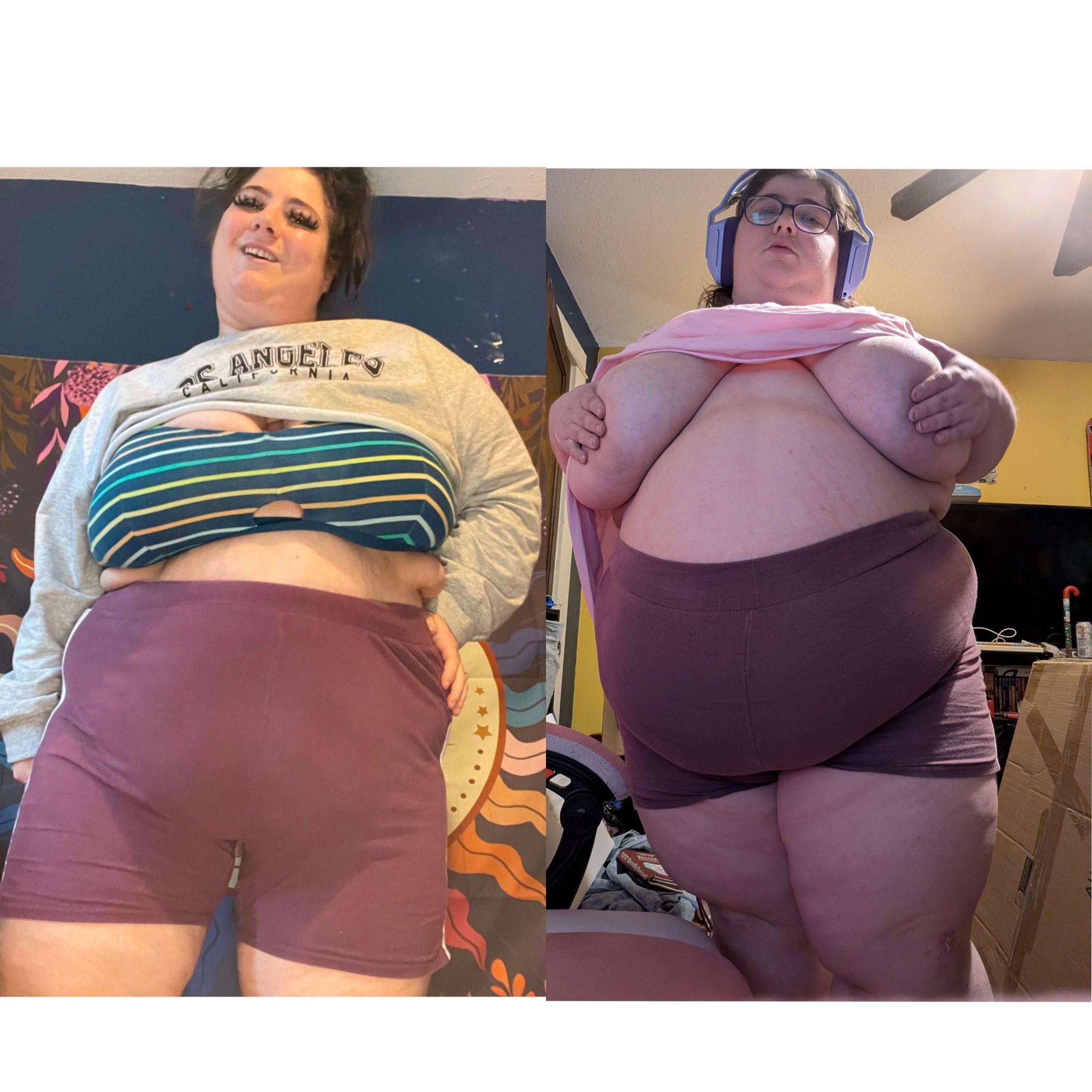 >>838589 Бывает и такое.Одна знакомая резко набрала вес.За год около 8-10 кг.Как раз плюс минус 25 лвл,165 см с примерно 55 кг до 65( с её слов, не взвешивал). В закрытой одежде не сильно заметно было, разве что второй подбородок появился.Но вот в открытой... её "старой" одеже разница была огромна.Так как мышечная масса осталась той же,а добавился только жир, везде.Равномерно, по всему телу, плюс появился даже не животик, а такое вполне себе скуфское пузико.Этакий бесформенный кусок желе.