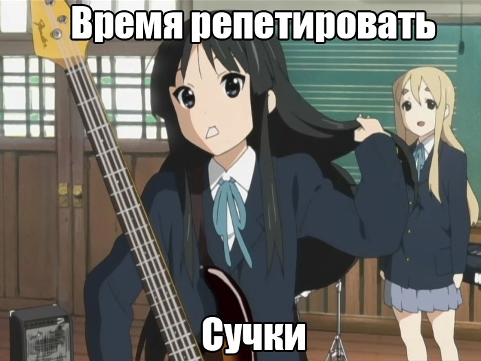 — Можно с вами поиграть? — Мест нет. — А на следующей неделе? — У нас чаепитие. — Может, хоть на табуреточке посижу, послушаю? — Нет, мы торты едим. — Я бы хотел вступить в клуб, а вступительные взносы есть? — Извини, у нас уже есть Юи-тян. — Может, ещё одна гитара пригодится? Или маракасы? — Мы никого не ищем, мы просто пьём чай.