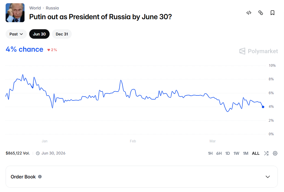 >>62165780 Кстати по графику отлично видно, что слухи о смерте Путина - лишь слухи. Если бы и вправду был кипишь - его окружение побежало бы делать ставочки.