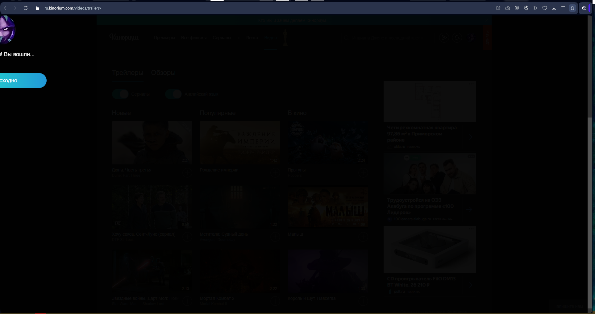 и куча рекламы. раньше чтобы посмотреть трейлер ты должен был 2, а то и 3, рекламы посмотреть. сейчас вроде нету такого, наверное кому-то это тоже очень не понравилось. ну и по бокам реклама которая адблоком не убирается.