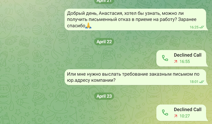 В ожидании результатов данной проверки я решил съездить погулять в Набережные Челны, сходить в кинотеатр. И вот выхожу я с сеанса и получаю такое сообщение от одного из специалистов найма.