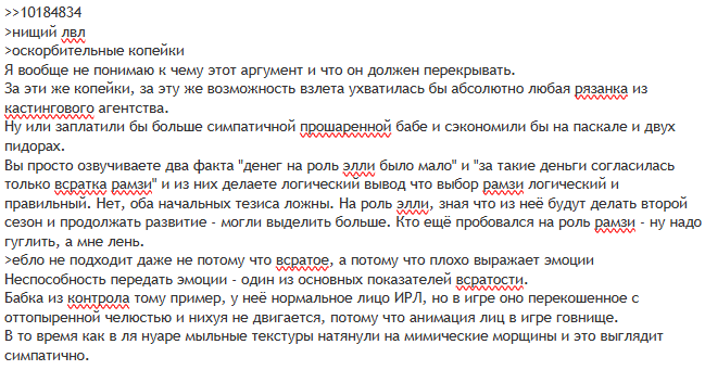 2. Я заебался постоянно всяким рандомам объяснять как ребёнку очевидные вещи, и чтобы не тянуть эту ебучую резину, решил скрафтить атомную бомбу, которая также будет являться ультимативным инструментом. Ну, типа, теперь если что, я не буду ни с кем спорить насчёт тлоу2, а просто скину ему эту статью, и всё. Максимально продуктивно, к тому же экономия времени. Да и в принципе, у меня все эти споры сходили на нет ещё году в 2023, если не раньше, уже не помню. Так иногда на протяжении трёх лет можно было с кем-то потрындеть, но потом заебало. В 2020 и 2021 конечно ситуация была совсем другой, ибо угольки тогда были ещё совсем жёлтенькими. Я просто смирился с ситуацией. Не, ну а чё, мир нестабилен, хаотичен. Чем бы дитя не тешилось, как говорится. Пусть они, например, воспринимают элльку уильямс как звезду поп-музыки. Хуле теперь? Чё, мне этих детишек, и всяких долбоёбов теперь ненавидеть что ли? К этому можно отнестись со смехом, также как и к телосложению ебби, что я кстати всем советую. Помню говорил: «ну бля, пацаны, это кринж конечно, но над этим ведь можно поугарать». Наша жизни в целом намного забавнее, чем может показаться. 3. Я хочу донести людям массово свои мысли, так как я зашёл в теме тлоу2 очень далеко, в первую очередь благодаря своей способности нестандартно мыслить, во вторую очередь благодаря тому что я знаком с этой вселенной ещё с декабря 2013 года. Я ждал вторую часть с того трейлера, который показали в декабре 2016. В начале 2019 года с корешом помню общался, ещё бухой был, и он такой «а ты чё, не в курсе, там трейлер тлоу2 ещё один вышел», а я такой типа «да ну нахуй», и пересмотрел этот трейлер раза 3 наверное. Я это к тому, что я в этом супе, касательно тлоу2, варюсь уже 6 лет, и за это время мимо меня прошло множество информации насчёт этой игры. Я мог бы надыбать всё это ещё в 2020 году, если бы захотел, но что-то как-то не было особого желания так углубляться. Типа, я наверное считал, что и так всё понятно. Не, ну в принципе, моё мнение-то почти не изменилось за все эти годы, но сама по себе ситуация потихоньку начинала прояснятся, и теперь ясна как июльский полдень. Но теперь нужно подумать, какими способами можно распространить этот материал… Люди должны знать ПРАВДУ!.. Никаких компромиссов, даже перед лицом Армагеддона. 4. ЛГБТ-поветска должна навсегда уйти из нашей жизни. Вот мне говорят, «ты, типа, простой сельский скуф, чё тебе это повестка? Даже в городе, в области которого ты живёшь, никаких гей-парадов не проходит», а один раз на канале IGM, который, как я уже писал, помазался подзалупным творожком, какой-то ебантяй сказал «ребята, успокойтесь, это ж всё в Америке, это не наша война»... ДА РОТ Я ЕБАЛ ВАШ БЛЯТЬ. Если, блять, кто-то чем-то занимается не на виду у всех, это его личное дело. Как говорится, кто как и хочет, так так и дрочит, но эта залупа проникла в массовую культуру, и теперь она может оказаться в каждом российском доме, как и в каждом китайском, австралийском, бразильском и так далее... Не застрахован ни один квадратный метр площади Земли, даже Антарктида, блять! Так какого хуя это не наша война? Наши игры ПОРТЯТ! Наши игры, блять, УНИЧТОЖАЮТ! Они убили Джоэла! Они уничтожили, блять, нашу вселенную! Какого хуя это не наша, блять, война!? Мы должнны, сука, бороться! Вот я и борюсь, блять! А вы, если хотите, ебучие игрожуры, и прочие пидорасы, сидите и обмазывайтесь подза