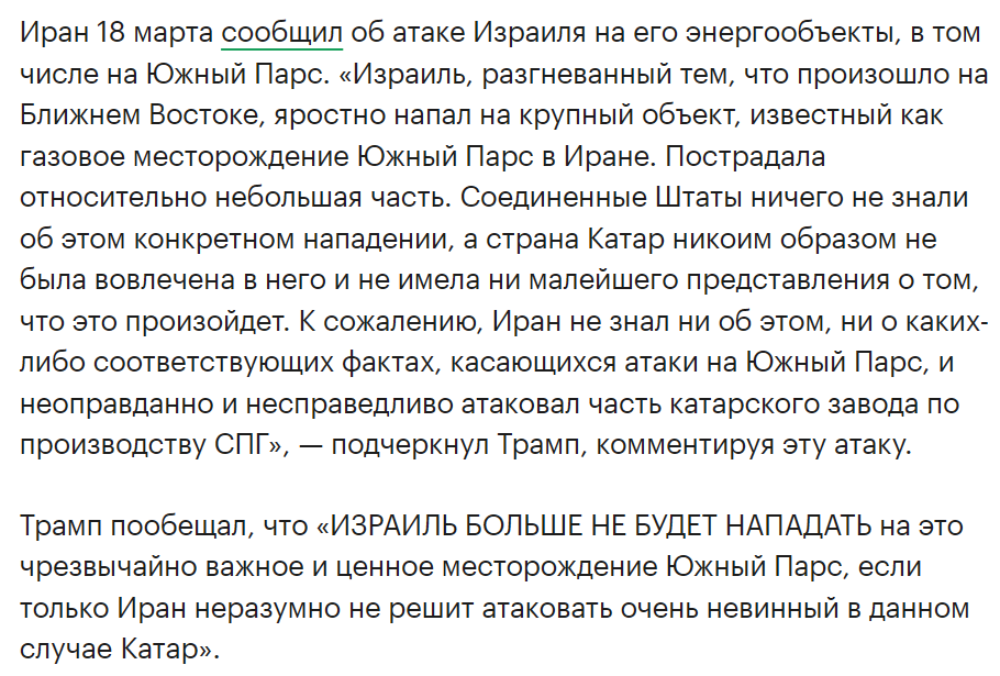 >>62230594 > Иран по прежнему бомбят так то. Просто нет ударов по энергетике Они ударили по газовой структуре, в ответ Иран ебнул по энергетической инфраструктуре арабов, Трампу пришлось откатить и дать обещание больше так не делать, ясен хуй не по доброте душевной, они бы бомбили это всё, но Иран сам их плотно за яйца держит.