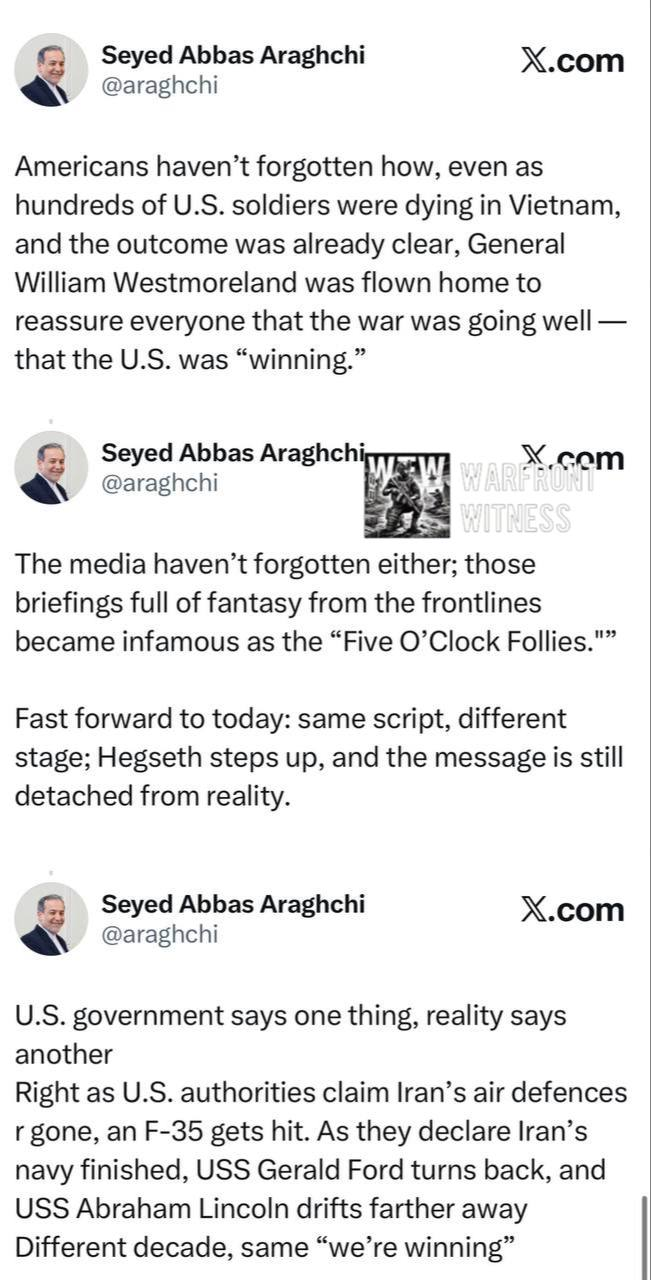 Иран не закончит войну пока Трамп не принесет официальные извинения Ирану а США не выведут все базы из стран Ближнего Востока и не выплатят Исламской Республике контрибуцию, заявил глава МИД Ирана Абасс Аракчи