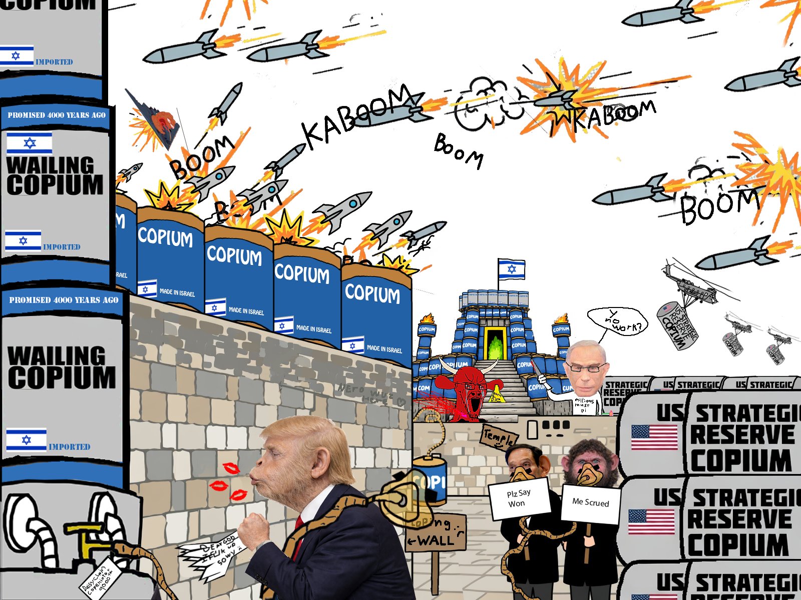 Трампыне, по-моему, похуй вообще, ему всё равно скоро помирать. Арабским диктатурам тоже похуй, иначе Саудия бы въебала аятоллам давно уже. Гейропейцы нахуй послали Трампыню с его ограниченной боевой операцией. Короче, хуйня какая-то постная выходит.