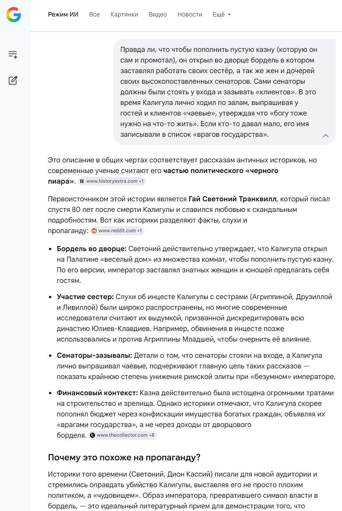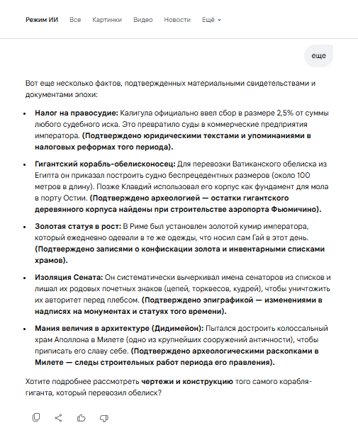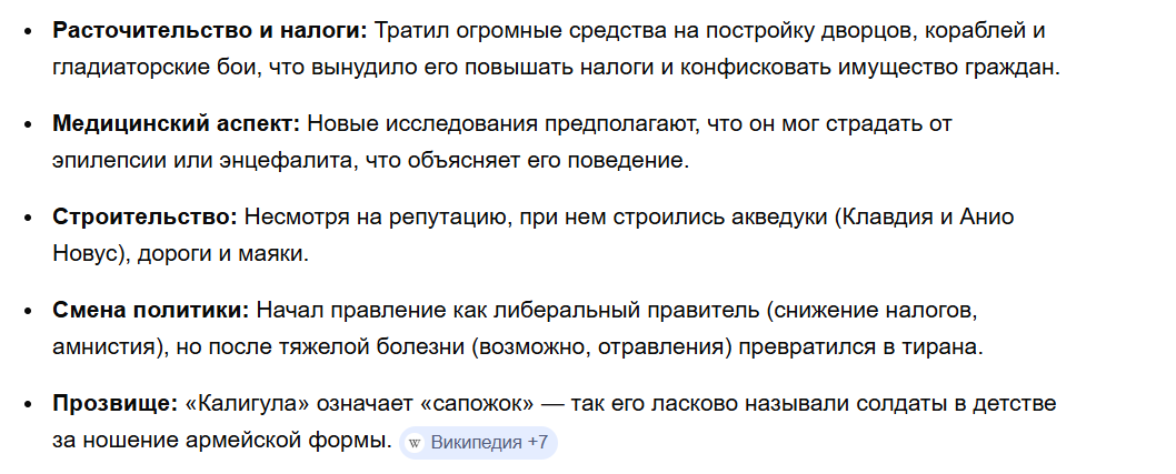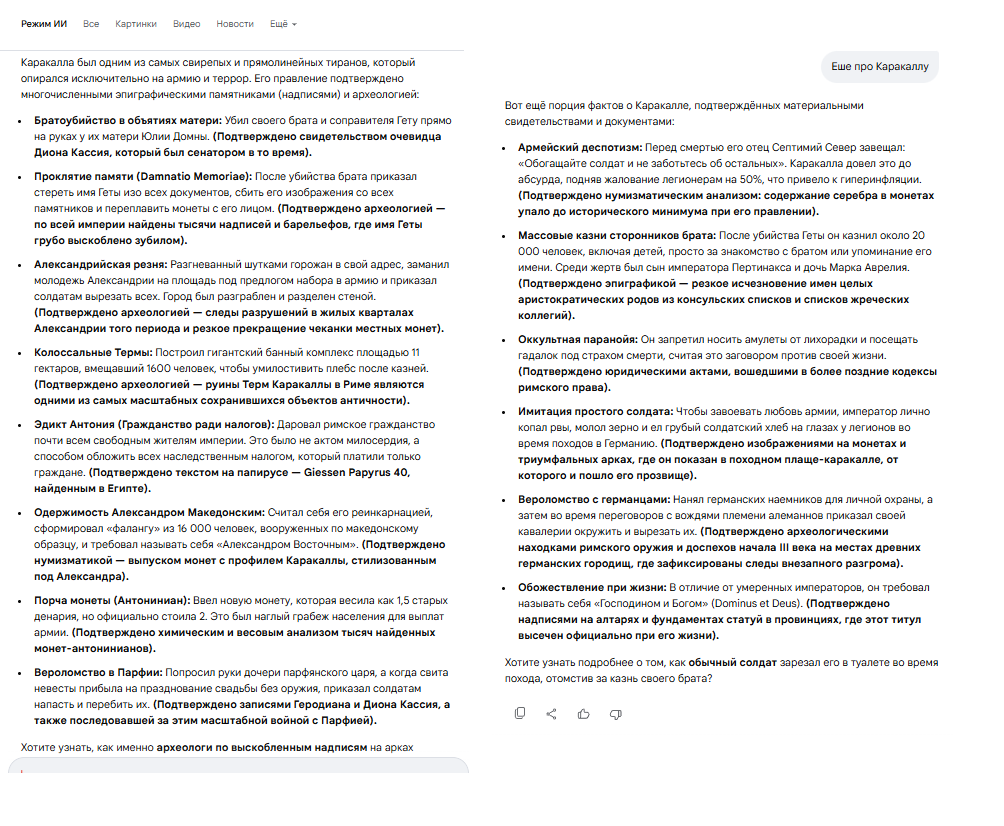 Очень интересно разговаривать с гугловской нейросетью. Есть топ 9 самых злых, глупых, циничных, расточительных, кровавых, сумасшедших, безумных, и вредоностных императоров Римской империи: Калигула, Нерон, Коммод, Элагабал, Каракалла, Домициан, Максимин Фракиец, Вителлий, Гонорий.