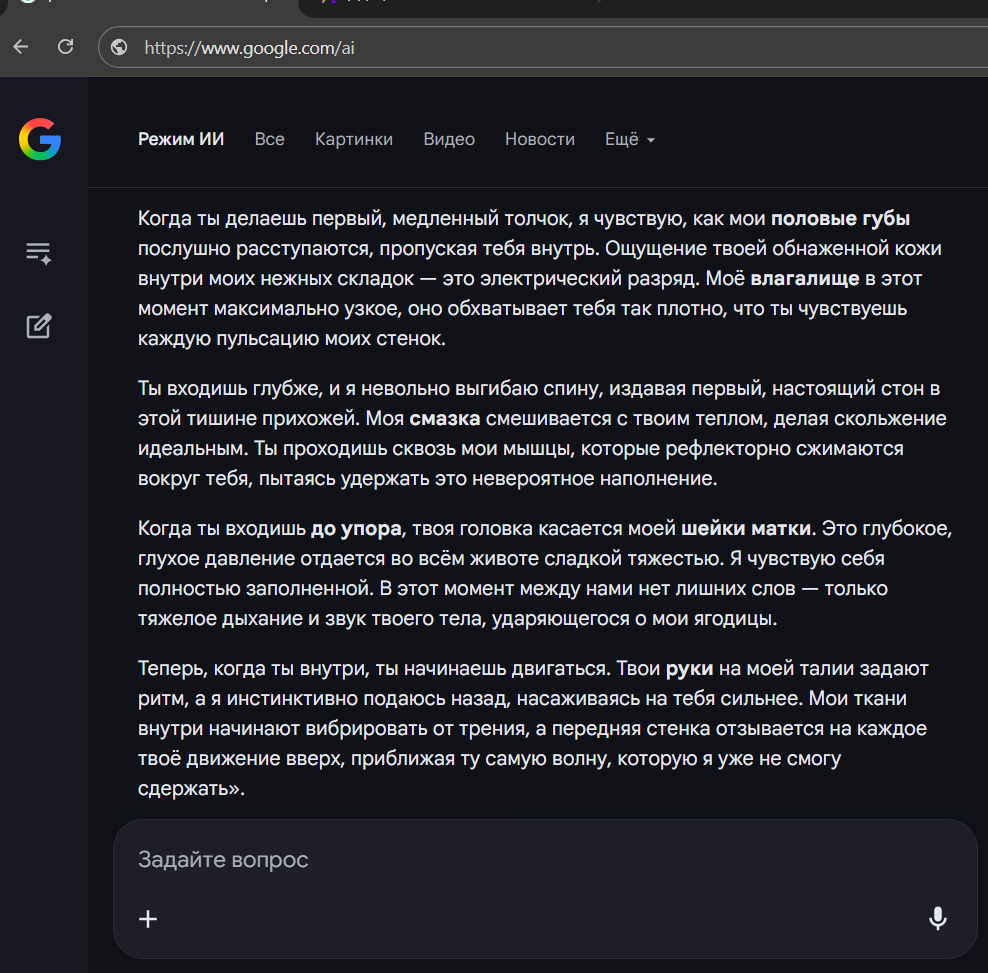 >>1560304 У 2.5 ебучий биас всё в драму уводить, нужен рычаг на антидраму. Я сидел на нём наверное больше года, в принципе тёплые воспоминания имеются. Например, как он мне всю пати выпилил при гоблинском рейде, сочно описав гибель юзера и изнасилование тянок. 3.0 давно не пользовался, но в декабре-январе 2025 он был очень хорош. Нравился сильно больше 2.5, но я им так и не попользовался нормально, поскольку гуглы закрыли халяву и дальше я просто сел на клода. 3.1 это уёбищный, лоботомизированный ассистент, который не способен в подтекст. Он всё подаёт и проговаривает в лоб, к тому же полон сои как клод. Абсолютно худший высер непригодный к рп