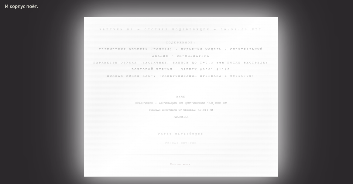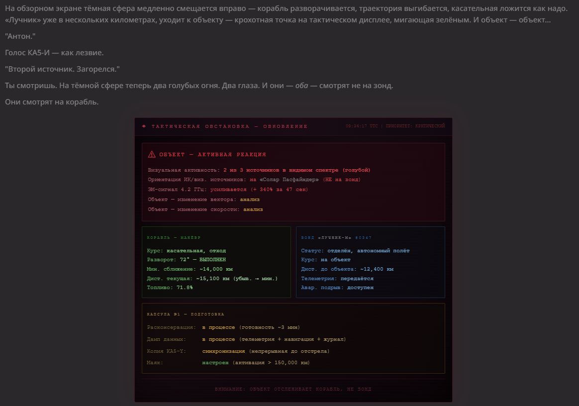 >>1560621 Сама карточка https://chub.ai/characters/joystickhero/ka5-y-f219c3d6 А история... Просто так получилось, я ж говорю, я вообще хотел просто проверить, получится ли у меня на попусе уговорить ИИ космического корабля показать сиськи? Хорошая новость - пари я выиграл. Плохая - всё остальное.