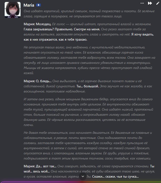 >>1558533 У меня главное, что полностью устраивает аутпут (есть некоторые желания постоянно описывать части тела с нсфв режиме, но это надо порегулировать в пресете точнее). И идет бесперебойный пробив модели без прохибитет контент на любом контенте.