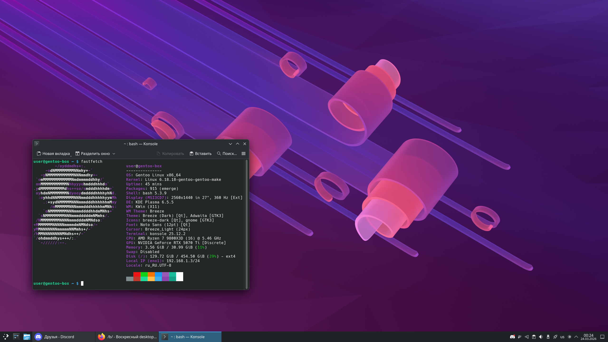 >>331081421 да факт, нечем похвастать, к чему понты. Красивенько понятие такое. Орфей не спустился бы в Аид за Еленой, а Менелай не развязал бы войну из-за Эвредики. dwm на иксах же, а я решил вейланд затраить. Про палитру согл, больше зеленый люблю, в процессе настройки (этап - леее, да пох). Это LXQt-шная arc-blue. Если есть в зеленых тонах палитра г заценим обсудим. Спасибо за проявленный интерес)