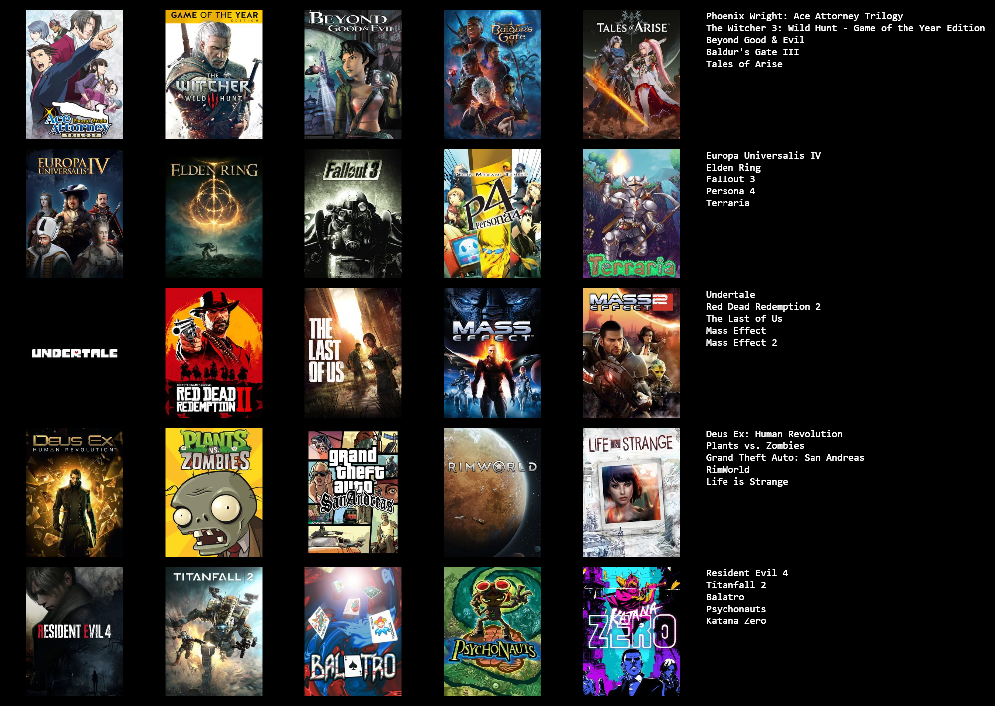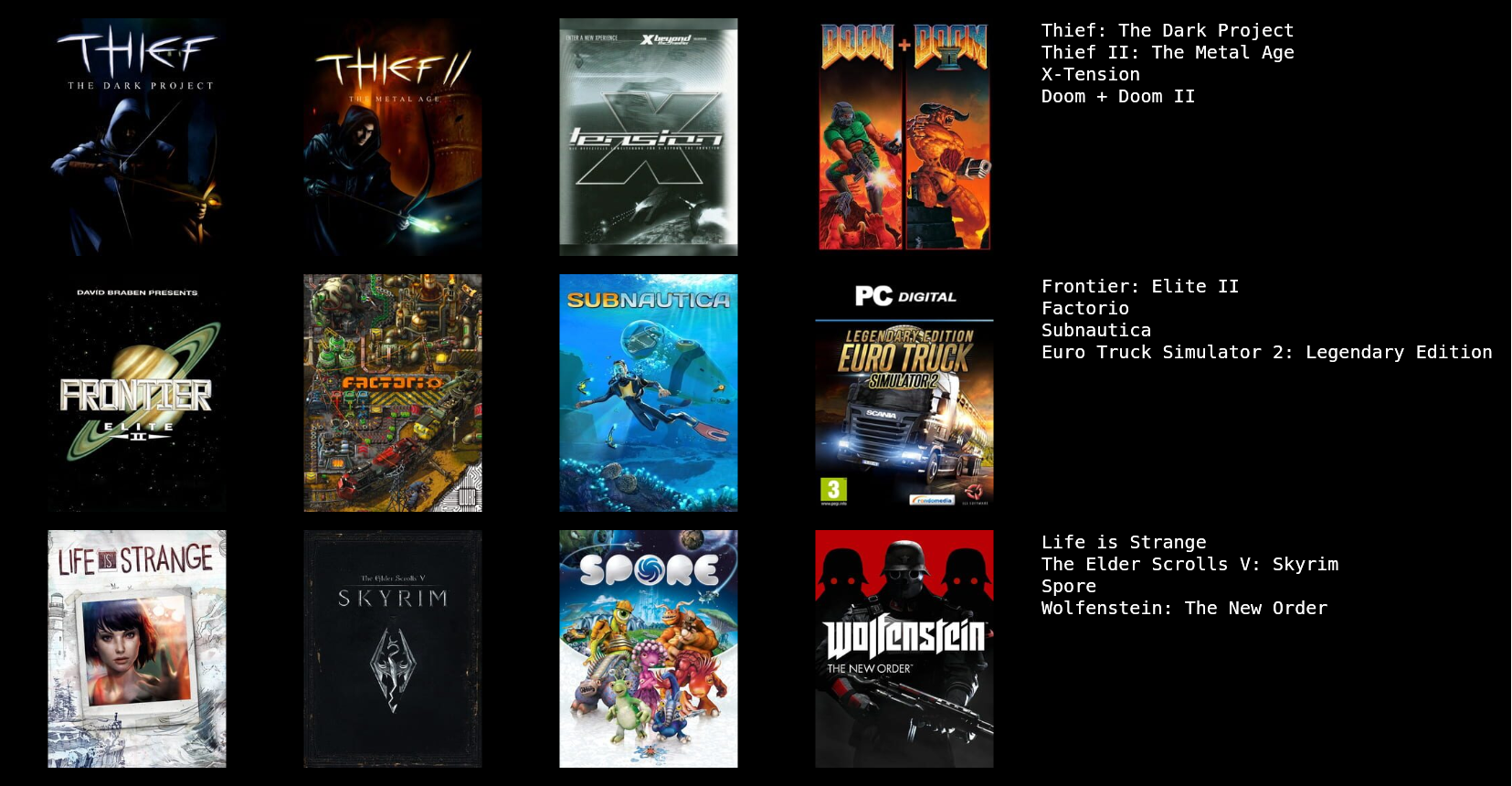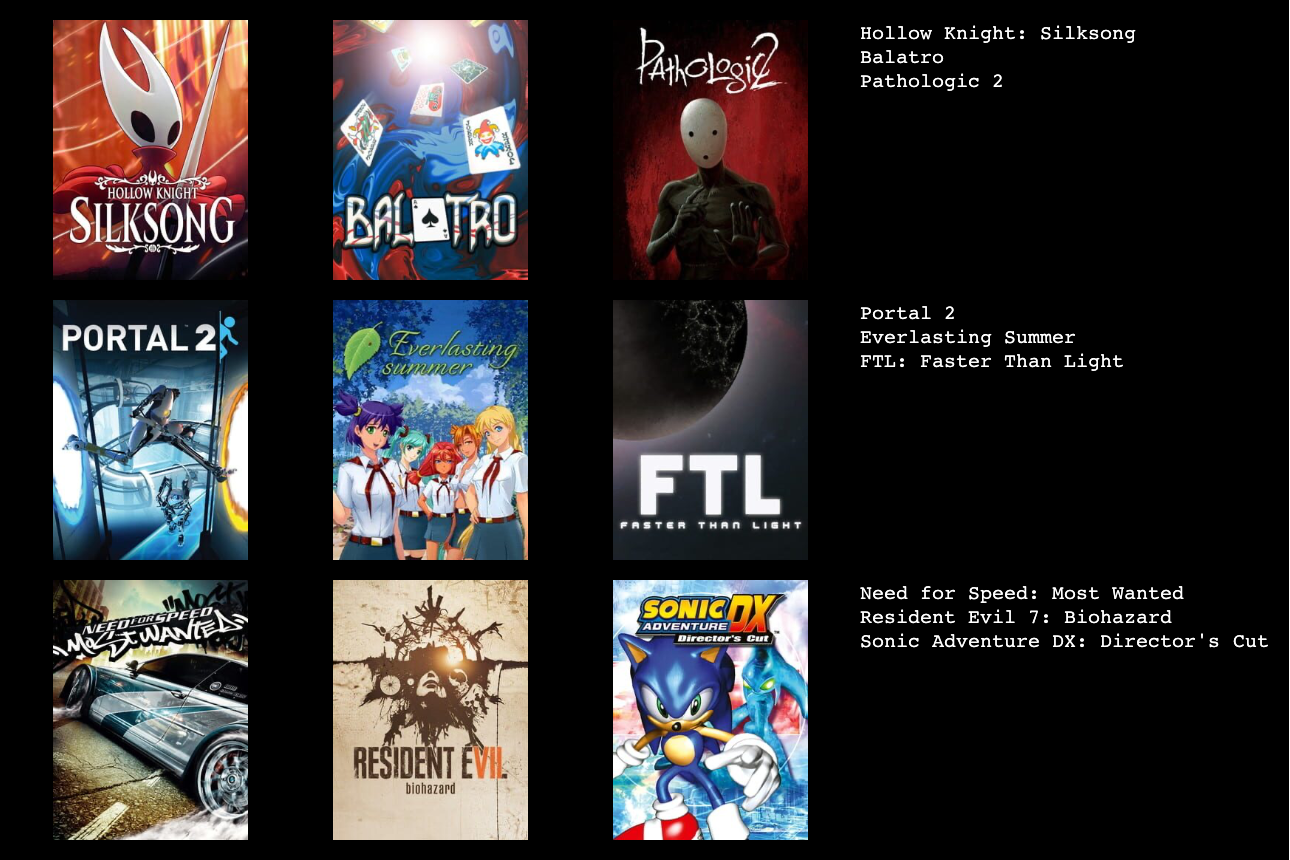 лень собирать коллаж через сайт для меня наверное нью вегас, манхант 1 и хотлайн майями 1 плюс какую нибудь доту, как "бесконечную" игру, хотя она меня уже заебала достаточно давно, на замену ей пришла пое 1
