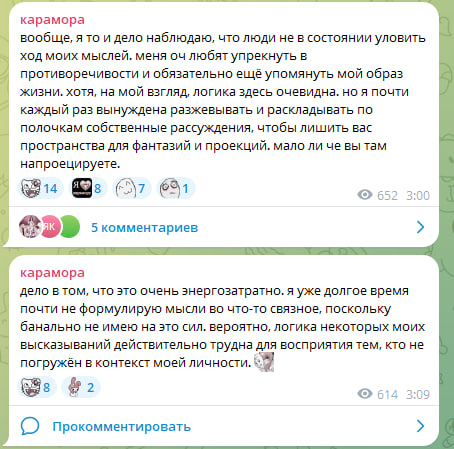 >>6474483 Катька не права тем, что она значительно старше и вообще полезла к этой чмошнице + половина ее текста воспринимались как истерика. Как будто человек недоволен своей жизнью и ищет на кого бы сорваться. Если бы к Караморе зумерши десантировались с обсером внешки и осуждением проституции, воспринималось бы лучше. В 28 до пизды уже кто там молочный поросенок и как жить женщине в патриархате. Охуенно.