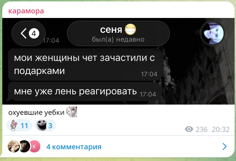 Сисы, кто сможет принести момент? Там Конина открыто говорит, что наебывает Клопа и кормит ее завтраками Я же говорила что он та еще мразь и если когда-то Клоп его бросит, там много еще говна с него польется, и все комплексы Клопа там не только от мамашки пьявки, но и от этого долбоеба, не понимаю, как кто-то дальше в этом озлобленном бывшем жирном пацане может видеть забитого чмоху, как раз такие потом на своих девушках и отрываются Клопа не жалко, мизогинка с салатами получила то, что заслужила, но-но