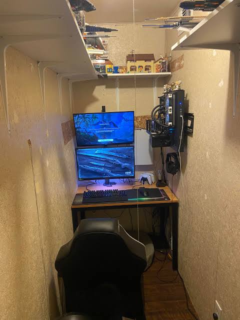 У меня комната очень засранная вещами и чуть стыдно фоткать. И ремонт не очень. Но есть пк, тв, консоль, кровать, мини качалка, ещё готовлю тут кушать и холодильник есть небольшой. Все как у тру хекк альфачей.
