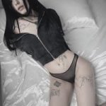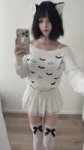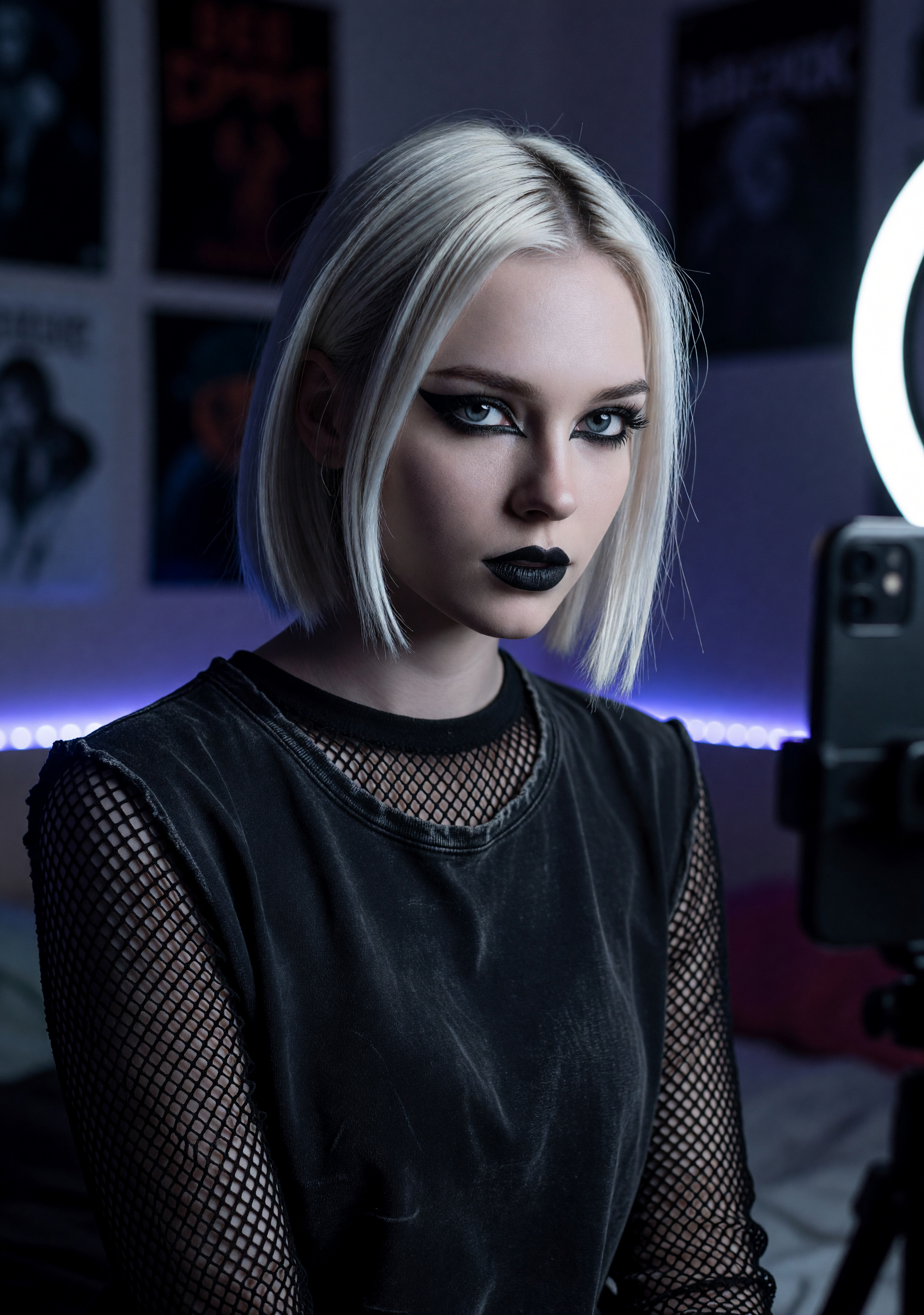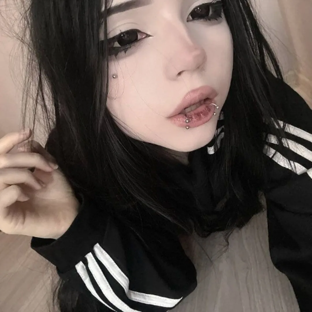 Альтушка ещё одна Photorealistic full-body selfie of a beautiful young woman with shoulder-length messy black hair with bright blue tips and straight bangs, pale skin, sharp winged eyeliner, septum piercing and lip piercing, wearing a black spiked choker. She is sitting on a black fluffy rug on the floor, knees bent and pulled up towards her chest, one bare foot raised and prominently visible in the foreground. She wears an off-shoulder white ruffled top with black leather harness straps and buckles, and a short black skirt. Holding a black smartphone with cracked-pattern case in her right hand, taking a mirror selfie. Seductive yet calm expression, looking slightly to the side. Anime-style posters, gaming PC, plush toys and green hanging plants in the background. Soft natural daylight, highly detailed skin texture and hair, realistic fabric folds, iPhone photo style --stylize 250 --v 6
