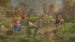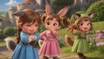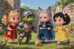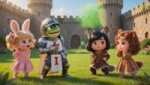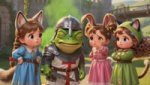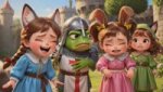 промт для изображения: crusader pepe playing with 3 bossbaby style females со звериными ушками и прическами и одеждами, playing outdoors