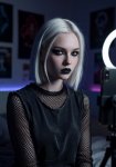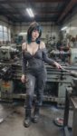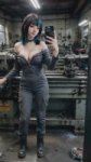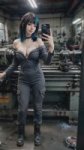 Для заводчанки в штанах Photorealistic full-body photo of a beautiful young goth girl with shoulder-length black hair with bright blue tips and straight bangs, pale skin, sharp winged eyeliner, septum piercing, lip piercing, black spiked choker. She is wearing only a tight dark gray work jumpsuit (mechanic style overalls) with the top part unzipped and pulled down to her waist, exposing her bare shoulders, chest and black bra straps. The jumpsuit has multiple pockets, zippers and stains from work. She stands confidently next to a large metal lathe machine in an industrial workshop, one hand resting on the lathe, the other hand holding a black smartphone taking a mirror selfie. Calm seductive expression, looking at the camera. Dramatic workshop lighting with strong overhead lights and some natural light from windows, tools and metal shavings on the floor, realistic industrial atmosphere. Highly detailed skin texture, realistic fabric and metal surfaces, iPhone 15 photo style --stylize 250 --v 6