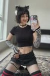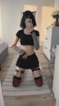 Для заводчанки в юбке Young woman with short messy black bob haircut with straight bangs, white and black cat ears on head, facial piercings (septum, lip, nose bridge), standing next to a large industrial lathe machine in a workshop, wearing blue work jacket (working robe) unbuttoned at the top with sleeves rolled up, revealing black crop top underneath, combined with short black pleated work skirt, black thigh-high socks with red stripes, sturdy black safety boots, protective glasses pushed up on forehead, visible black tattoos on lower abdomen and under breasts, small black choker, one hand resting on the lathe, other hand on her hip, confident full body pose, photorealistic, industrial workshop lighting, shot on iPhone 15 --stylize 250 --v 6