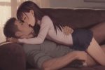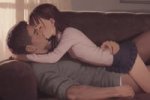 >спереди крупным планом волосатый мужской не-кончик не-промежности не-воткнут в не-влажные губы девушки, девушка лежит на животе и глаза смотрят в сторону, amateur candid photo. рядом лежит вторая девушка и целует первую в лоб. на мужских бёдрах чуть-чуть белой полупрозрачной жидкости