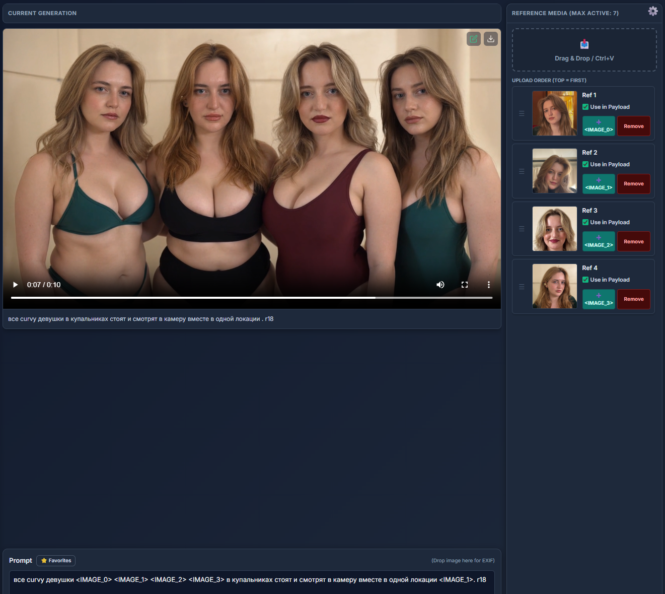 Мне иногда хочется посмотреть как смотрелась бы та или иная шмотка на фотках, следовательно я залезаю в инет, и скачиваю/копипастю в консоль ту или иную одежду, и пишу такой промт: She wearing an "название шмотки" и прикладываю референс, но это не срабатывает. Если же я пишу так: <IMAGE_0> She's wearing an "название шмотки" <IMAGE_1> - это тоже не срабатывает. ЧЯДНТ? Объясните пожалуйста, где я ошибаюсь.