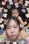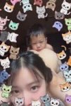 Amateur candid eye-level front-facing selfie of a young East Asian woman with long dark wet hair. She holds her phone straight in front of her face at exact eye level with her fully outstretched arm, taking a direct horizontal selfie as if looking into the front camera. Her face is very large, close-up and dominates the entire foreground, looking straight into the lens with a playful smile. Only her wet shoulders and the very top of her upper back are barely visible right behind her head and shoulders. She is kneeling and slightly bent forward inside a bathtub filled with water and lots of thick white bubbly foam that completely covers her lower body, hips and everything below the shoulders. Behind her and slightly to the side, a young toddler boy with half-blurred face stands in the water and clearly peeks out from behind her right shoulder, his head and upper body visibly appearing over her shoulder looking towards the camera. One cute tabby kitten wearing a blue starry party hat sits on the boy’s head, surrounded by bright exploding stars and sparkles in yellow, pink and purple. Many small colorful full-body cartoon girl watermarks covering the whole photo. Thick white foam hides everything below her shoulders. Wet glossy skin and hair textures, realistic water and bubbles, casual home bathroom atmosphere, vibrant digital overlays, fun and playful vibe. Social media story style with heart icons, share buttons, and Russian text caption at the bottom. Strict eye-level straight-on selfie perspective, phone held horizontally at eye height, face extremely close and large in foreground, no top-down view, no overhead angle, no full back visible, shallow depth of field focused on her face.