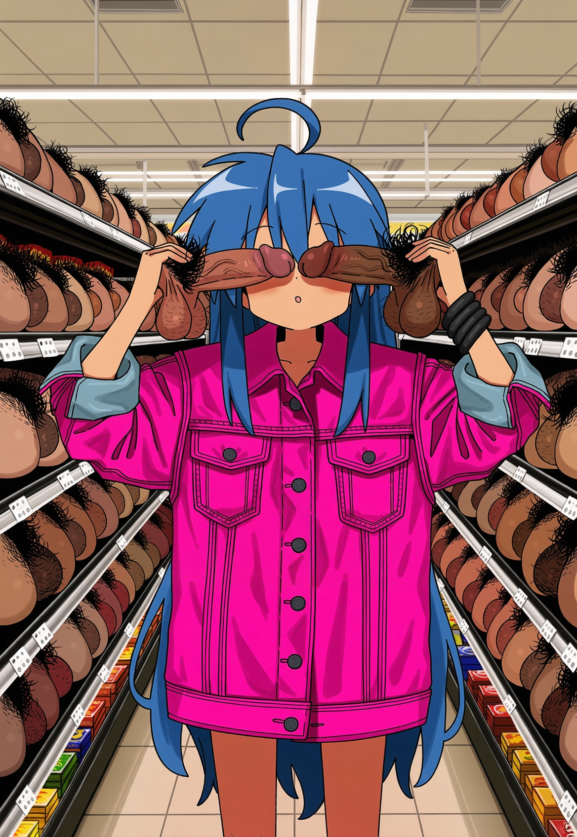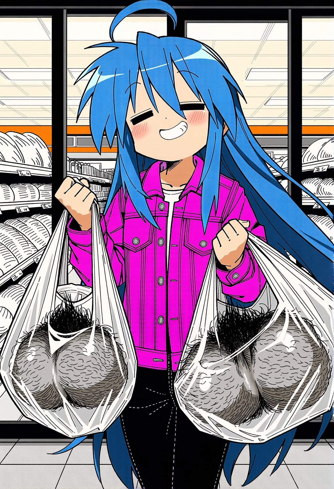 >>331133452 А можно сделать как она будет выходить с двумя тяжелыми сумками, содержимого этого прекрасного супермаркета? С довольным лицом, так как было много скидок на яцца и стволы.