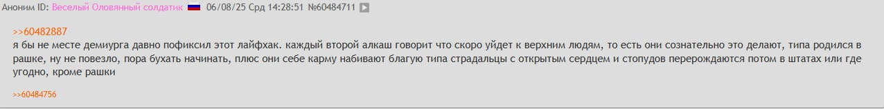 >>331121471 > Но детей то не будет. Ты с нигером или хачом не особо отличаешься, плодячку сворачивают потому что нормализовали поставки биосырья из дружественных стран, и они уже тут ассимилируются пока ты тухнешь в одиночестве. В чем ты прав, так это в том что за тебя уже решили, а ты молча согласился и вторишь методичке.