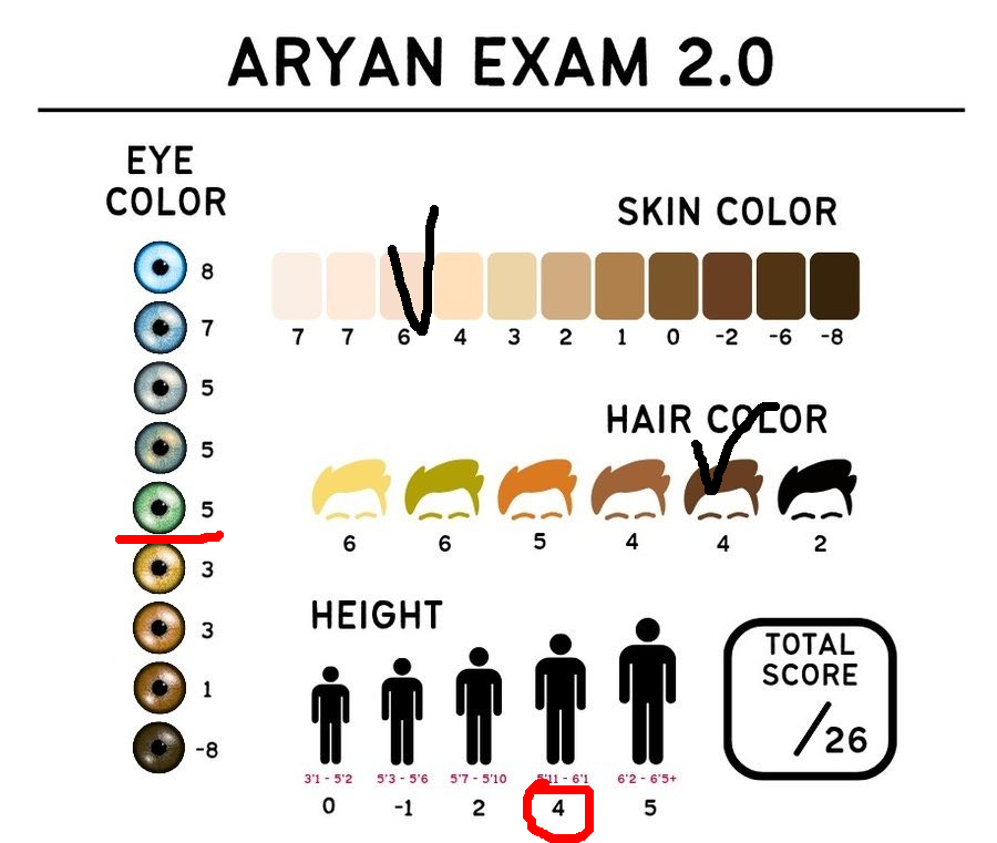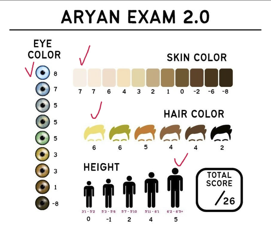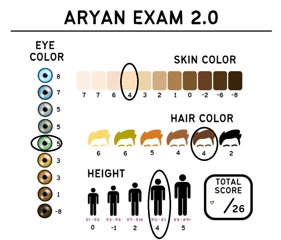 долбоебы до сих пор измеряют арийскость по пигментации очень показательный пример калейдоскопического мышления или розеточкового кретинизма если бы между расами не было разницы в пигментации эти люди же кроме шуток считали бы всех одинаковыми