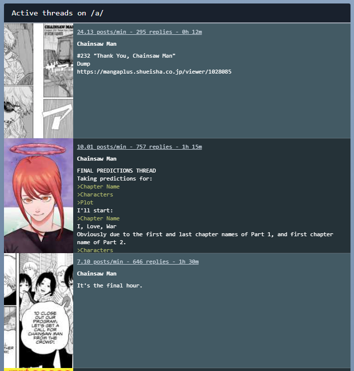 Сегодня не только конец Пилы, но и похороны Мангача. Можем гордиться, получили ачивку - Дожить до завершения всех сёнэнов. Остался только Кусок, но там мёртвый тред, живой в сериалах по лайвэкшену. Нужно что-то делать. Идите там во форчу пошерстите, каких тредов популярного слопа у нас ещё нет. Нужно как-то спасать доску. По Королевству нужно тред сделать и ещё на чёнить хайповое, мейнстримное.