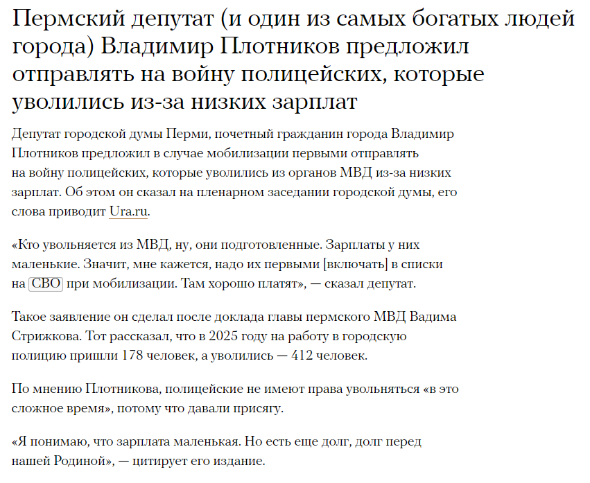 >>62220383 (OP) Менты в списке самых первых на могилизацию. Пока они трудоустроены в мвд, у них бронь. Как только бронь спадает, у военкомата на них самые актуальные данные, какой-никакой опыт, уровень подготовки, здоровья и лояльности (покорности) чуть выше, чем у среднего российского мужчины. А еще военные не любят ментов и спецслужбистов. И полицейские на самом дне государственной иерархии. Так что можно только пожелать успешного захвата коровников своей жеппой людям, продавшим совесть за пайку от государства и раннюю пенсию в 40 лет.