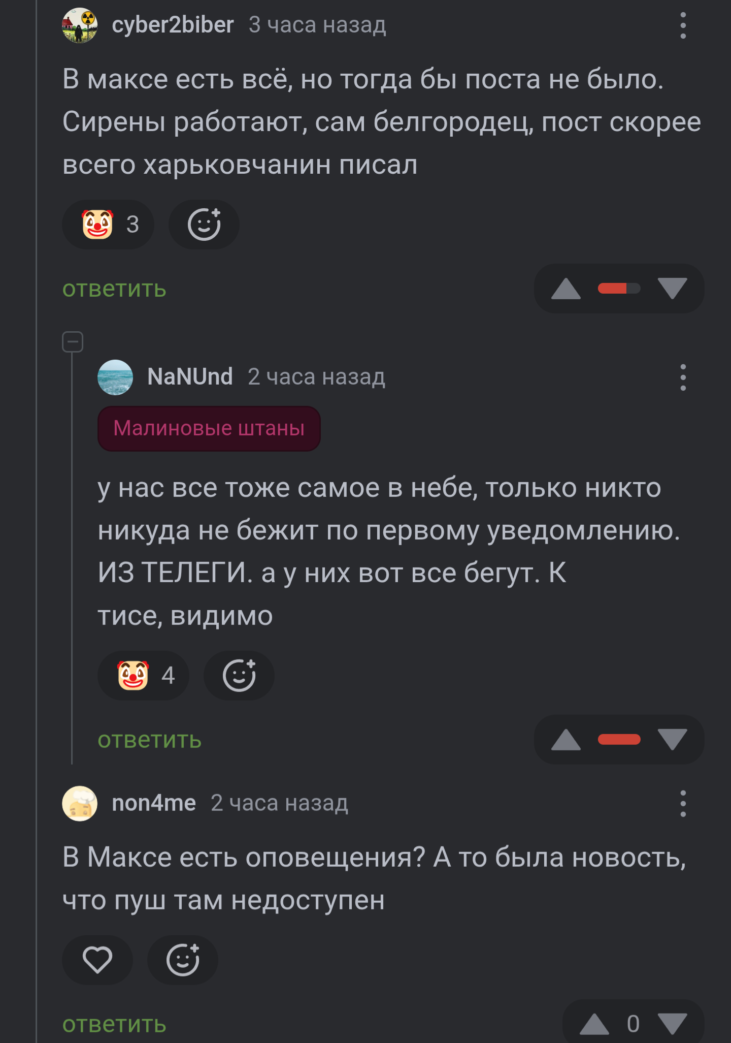 Я белгородец, мы живём в полной жопе, нас обстреливают РСЗО и дронами каждый ебаный день. Раньше мы прятались в укрытия по оповещениям в телеге. Теперь она стала враждебной кому-то из главных и её заблочили. Как сейчас происходит: прилетают ракеты или дроны, а через минуты 2-3 срабатывает сирена.