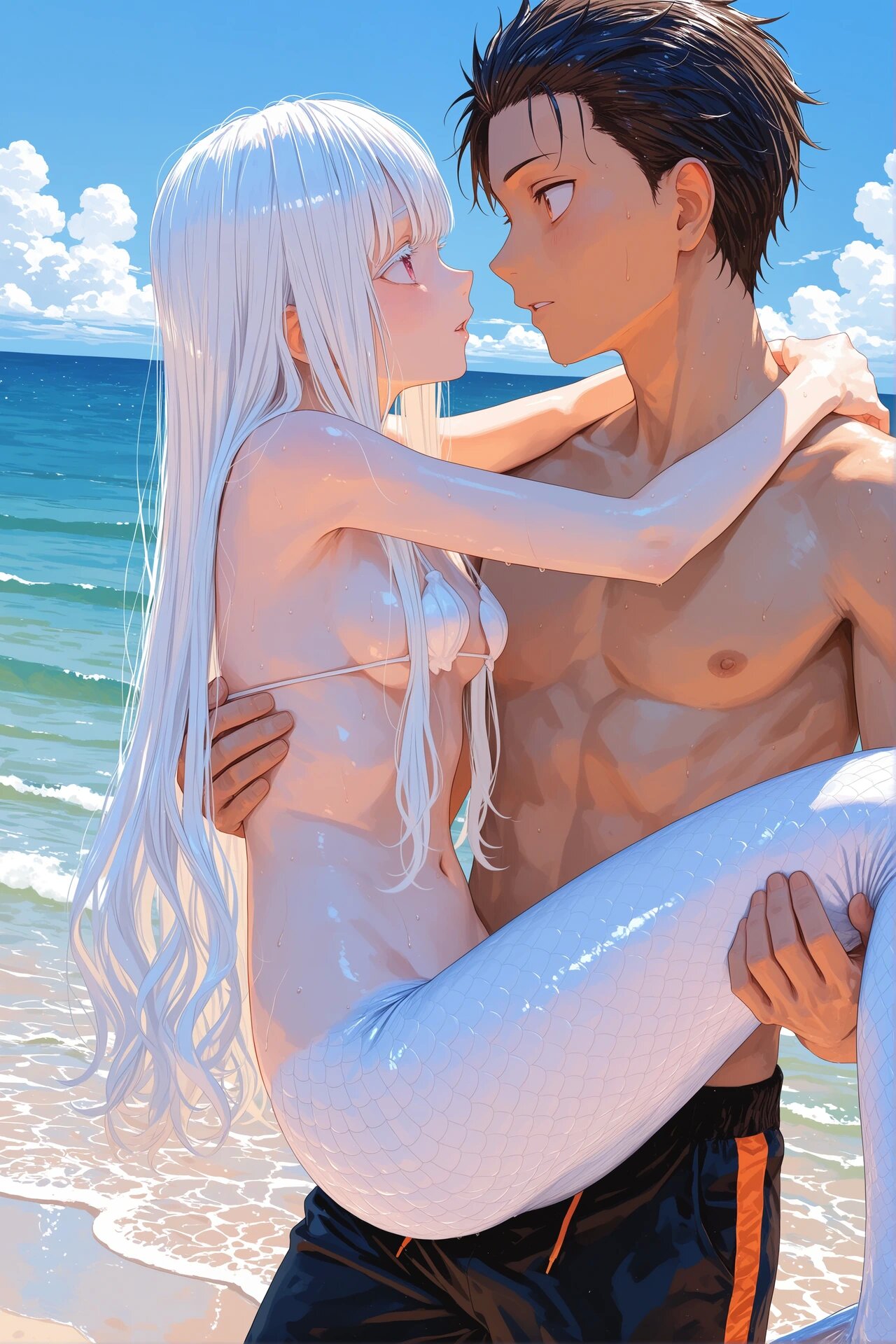 Сорри за шитпост и пост фрагмента чужой работы, два вопроса: 1. Как запромпить купальник с длинными рукавами? я пробовал на ВАИ one-piece swimsuit, long sleeves, но почему то генерировались рукава отдельно, купальник отдельно. Но нубе лучше, но в целом получается встратое качество, которое у меня не получается исправить. Плюс иногда начинает вылизать стилистика аниме One Piece, как с этим бороться? 2. Как запромптить вот такое положение бедер и ягодиц как на пике2?