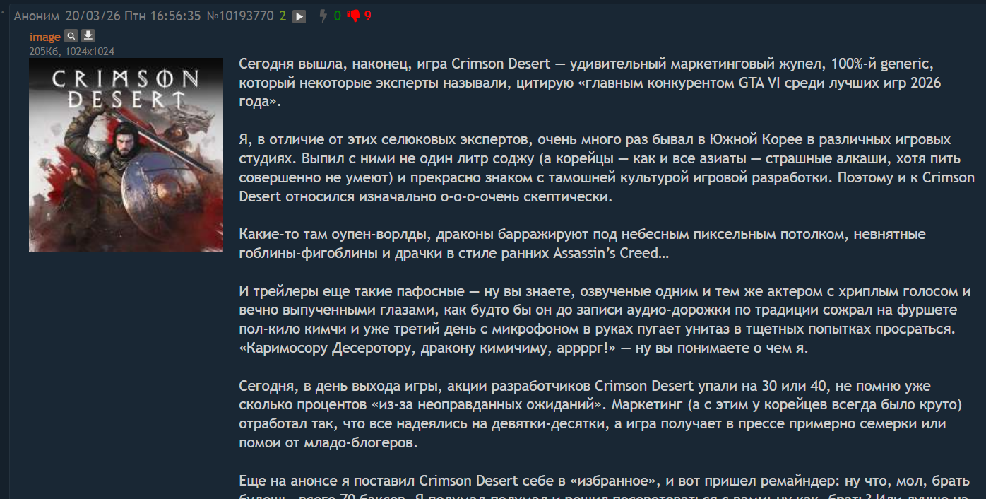 Сегодня, в день выхода игры, акции разработчиков Crimson Desert упали на 30 или 40, не помню уже сколько процентов «из-за неоправданных ожиданий». Маркетинг (а с этим у корейцев всегда было круто) отработал так, что все надеялись на девятки-десятки, а игра получает в прессе примерно семерки или помои от младо-блогеров.