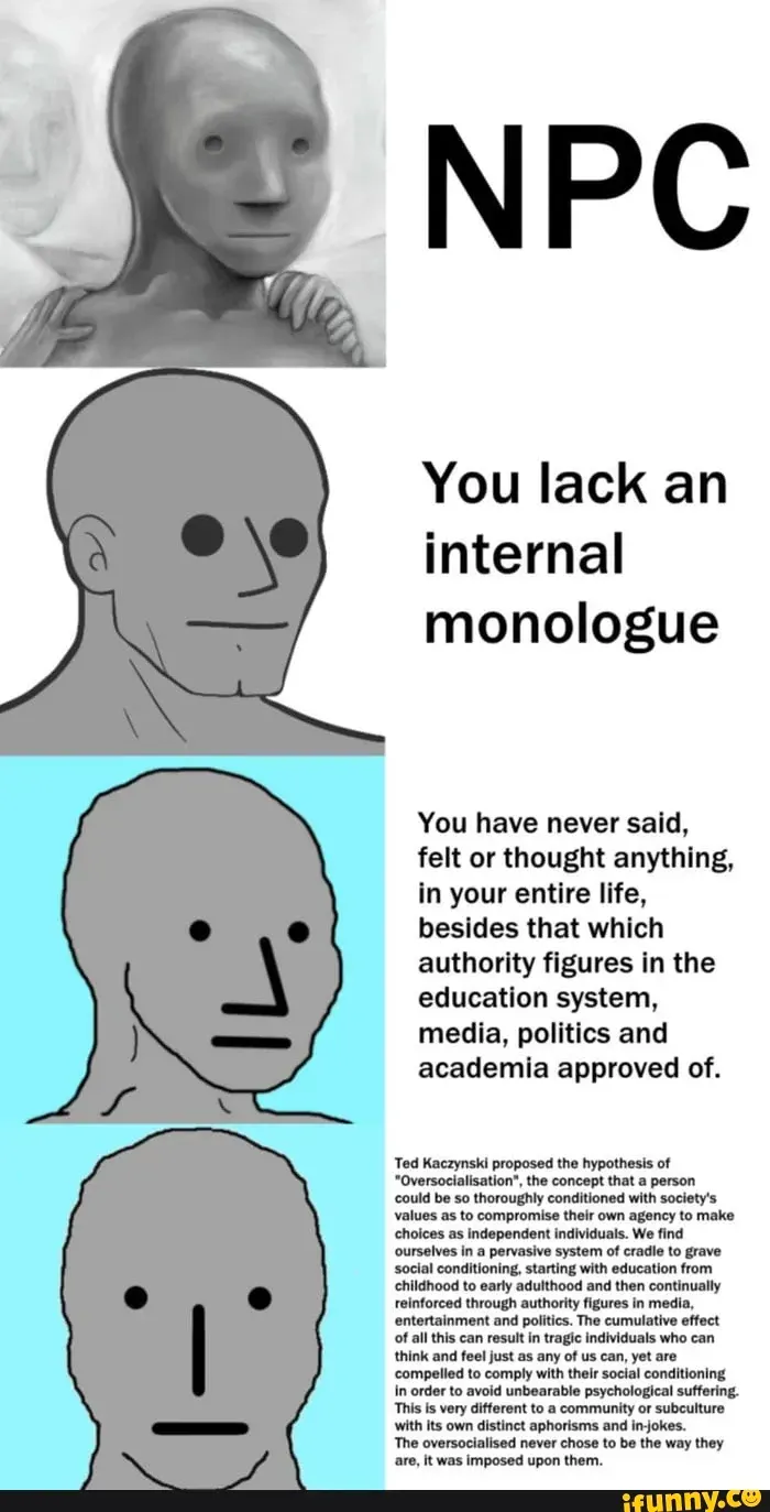 >>331221453 (OP) Не знаю почему, но весь этот мем про NPC похож на форс шизофреника который думает что обычные люди это NPC а настоящие люди только у него в голове