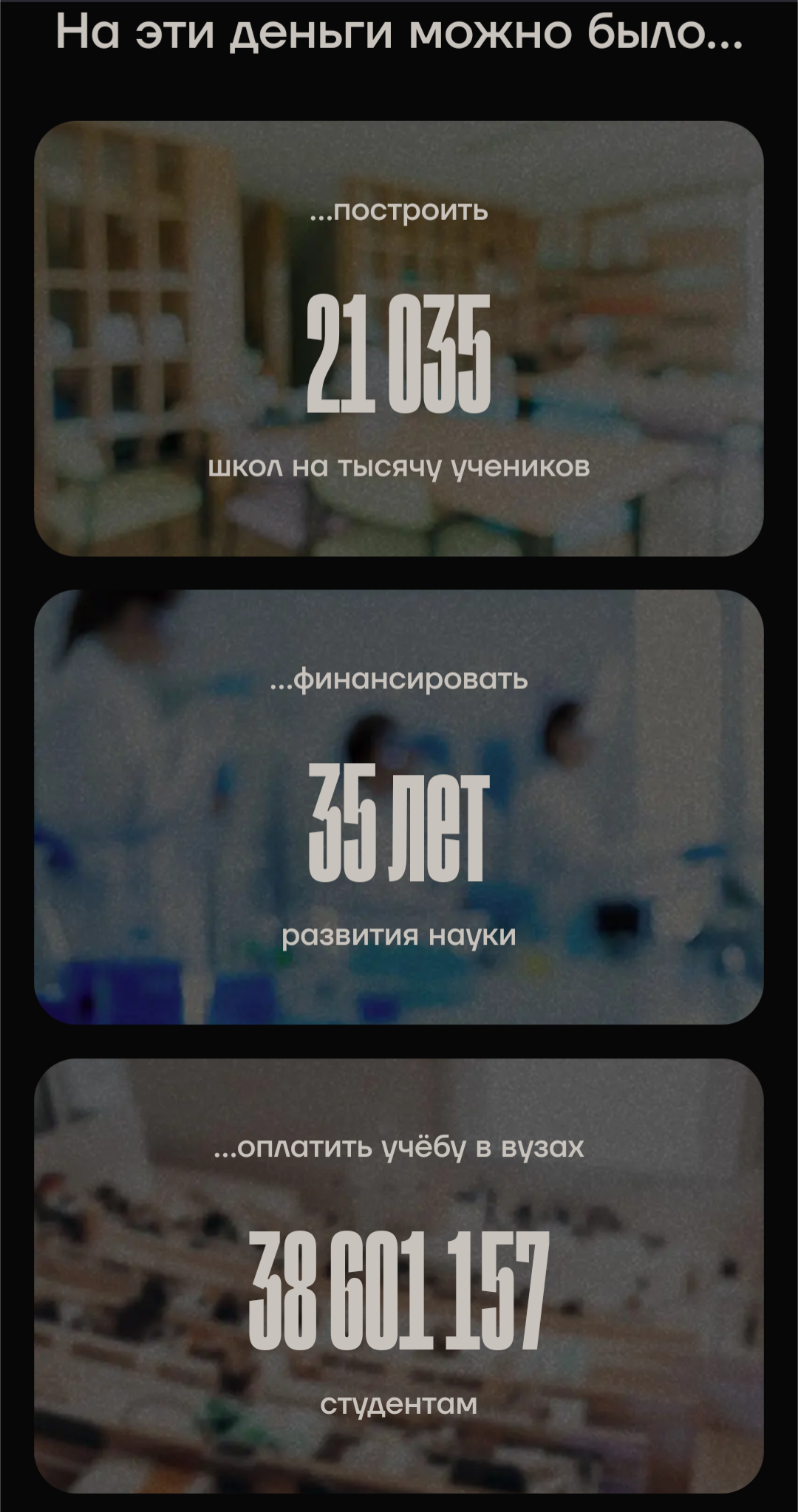 Почему не написали, сколько дворцов на эти деньги можно построить? Мне кажется, такое тоже надо указывать, чтобы достучаться и до самих чиновников, исполняющих указания ебанутой бабки.