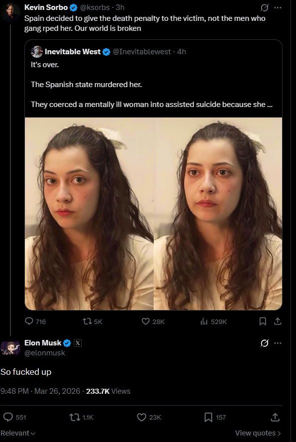25-летняя Ноэлия Кастильо подверглась групповому изнасилованию со стороны несовершеннолетних иммигрантов из Северной Африки в социальном центре после того как ее забрали у дедушки и бабушки из-за развода родителей. Затем она попыталась покончить жизнь самоубийством и осталась парализованной в обеих ногах. СЕГОДНЯ она была убита путем эвтаназии