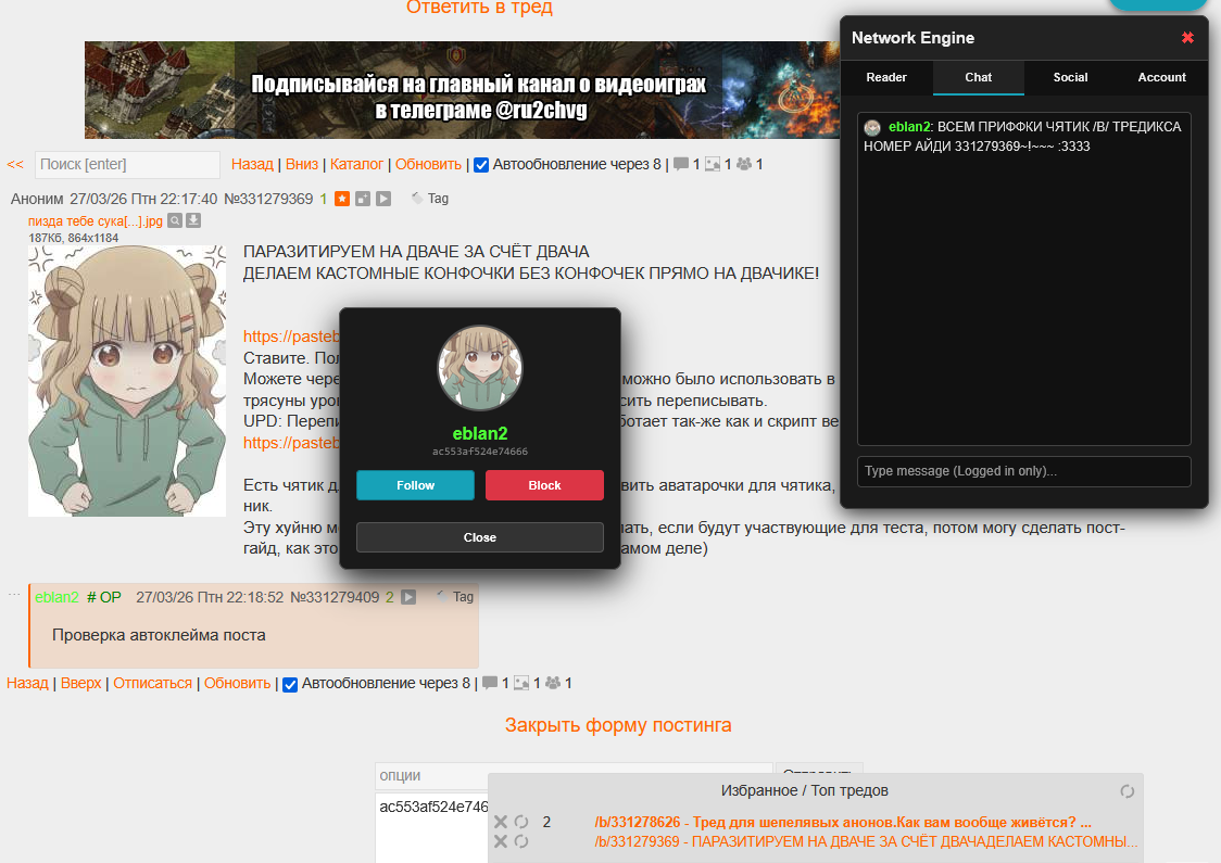 Есть чятик для тредикса, есть возможность поставить аватарочки для чятика, авто именование вашего поста в ваш ник. Эту хуйню можно положить в секунды если пожелать, если будут участвующие для теста, потом могу сделать пост-гайд, как этого добиться :3 (всё очень просто на самом деле)
