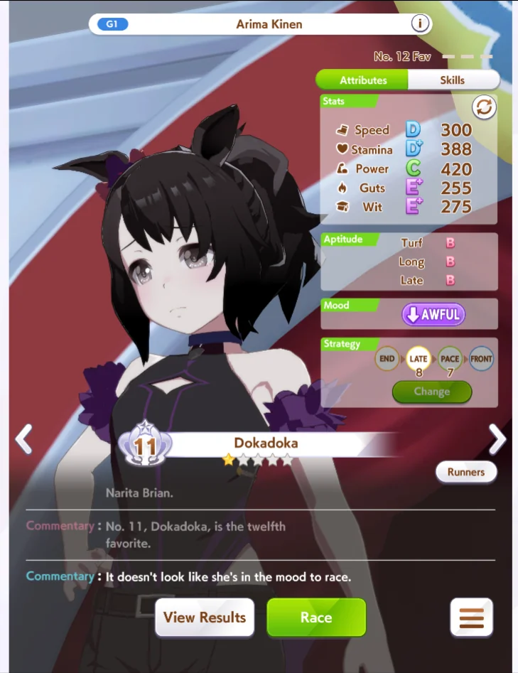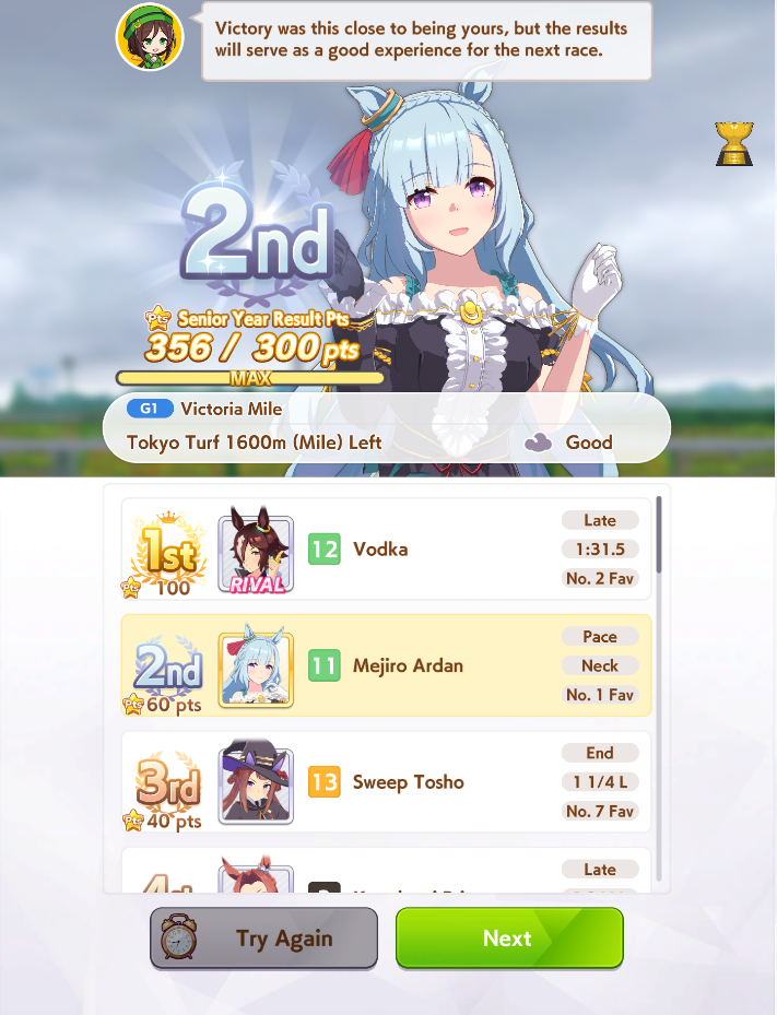 Если где-то не сложилось, можно заменить Арима кинен в конце декабря на 3ий год, естественно, если ты выиграл Ариму на второй год. Ещё в начале ноября есть дёрт гонки в ОИ - можешь там пробежать, но это если ты не идёшь на Тиару, а Огури не ходит, но тогда у тебя лютый пиздец график из 5-6 гонок подряд.