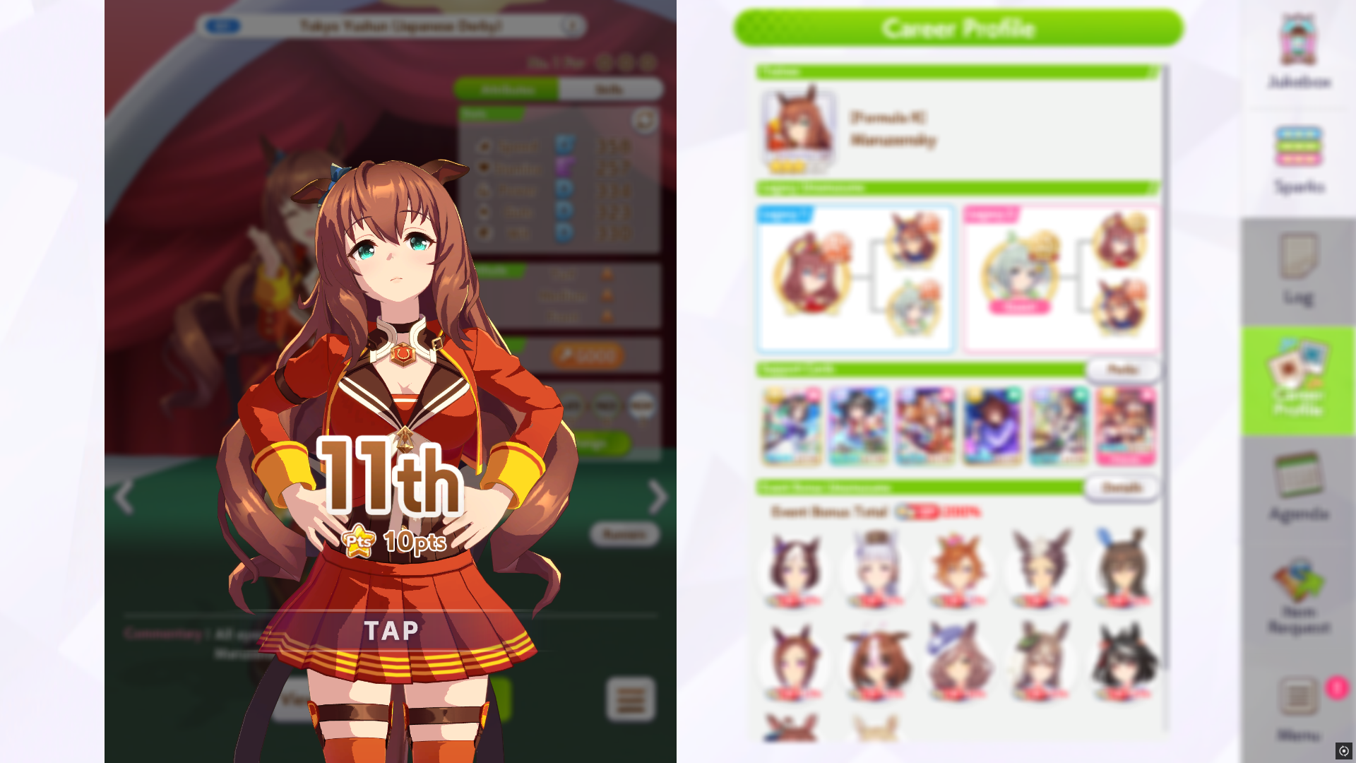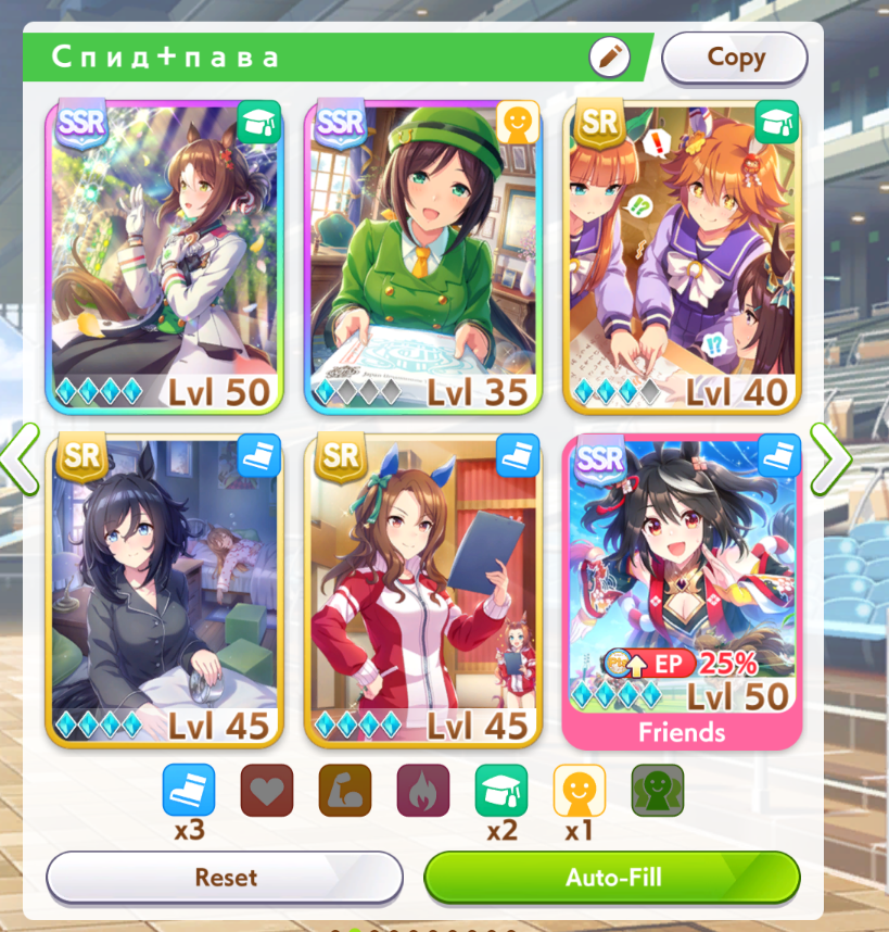 При желании кап по спиду мог бы сделать еще до второго лагеря, но остальные статы полный пиздец, вообще ничего не качалось, в районе 500 были или меньше. Охренел конечно с такого дисбаланса. А всё потому что карты с рейсбонусом - полное дерьмо по набору статов. Эта ивентовая Марвелос на паву статы вообще не качает, куча радужек а толку если даже с ней и всеми мегафонами-утяжелитилями летом там +18 а в остальное время даже +10 не набирается. С витом так же. Раньше играл с Тахион но она в пачке была, не замечал какое же она дно по статам, тоже выше +15 даже на радужках я на вите не видел до конца игры. Кафе по сравнению с ними еще хоть что-то может.