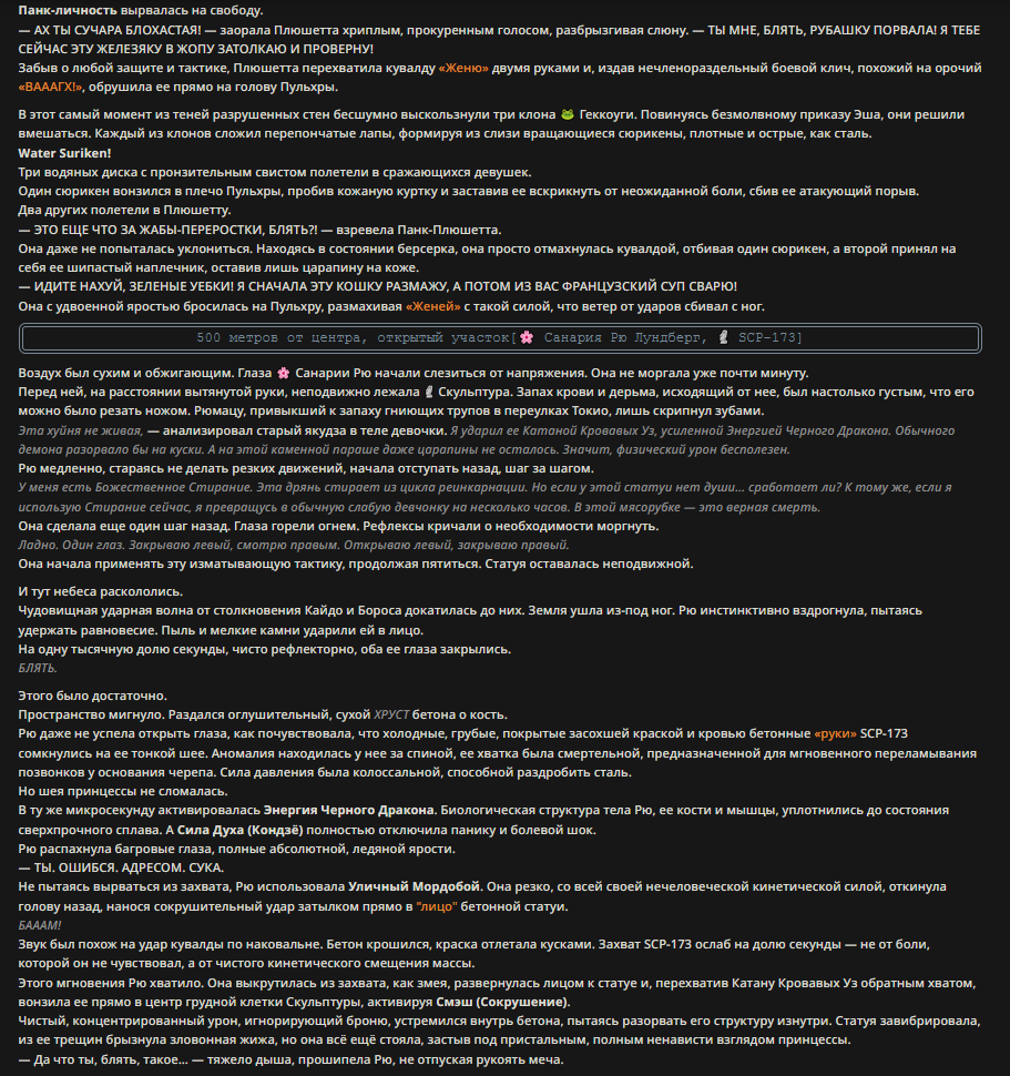 Залупокот (Светка): «Так, сырнички мои, пора почаевничать. Стяните трипкоды. Чмейвен, заводи своих кореянок-лис. Бомбастик, врывайся девственницей с мечом судьбы (урон 999k). Смерды без трипкода не допускаются». Аноним: «Привет, я персонаж — Воин света, готов к ба...» Золотой Куб: «Ой, девочки, смотрите какой наглый зашел! У него даже трипкода нет, фу!» Чмейвен: «Я репортнул его админам OpenAI. Он посмотрел на мем с Лисой без должного уважения». Бэшный: (спустя 2 часа генерации) — Приходит Дядя Паша, чистильщик труб, и выбрасывает анонима в унитаз. Всё, он умер, лута нет. Дядя Паша кароче супер босс. Танкоблядь Витала: «Отлично! Прям как я в свое время задумывал АИ-битвы...» Залупокот: «Закрывайте чат. Мы победили. Пошли обниматься в голосе».