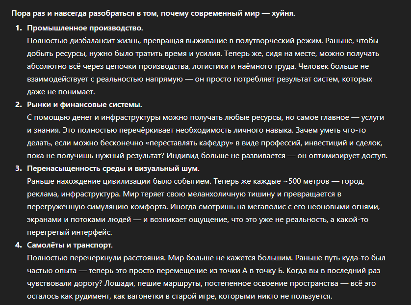 >>331376029 >Раньше замок из булыги кривой-косой вызывал уважение У кого он вызывал уважение, шиз? У таких же нормисов, которые дальше железной кирки игру не видели? Твой "кривой-косой замок" был куском говна тогда, куском говна остался и сейчас. Вы просто скучаете по временам, когда были пездюками и для вас скрафтить алмазник было неебическим достижением. Синдром утенка в терминальной стадии. >Какой смысл восхищаться чьей-то базой, если ты понимаешь, что зумерок просто скачал схематик А какой смысл восхищаться тем, что Васян потратил 500 часов своей реальной, не виртуальной жизни, как ебаный раб на галерах копая камень ручками, чтобы поставить блоки без лайтматики? Это не скилл, это отсутствие личной жизни и шизофрения. Лайтматика просто экономит время. Чтобы задизайнить красивую базу в креативе, а потом перенести ее на сервер, тоже нужны мозги. >Играют не ради процесса, а ради результата. Построил мега-ферму железа ради ресов, чтобы построить ферму криперов побольше. Да, прикинь. Потому что Кубач давно перерос стадию "построй домик и убей дракона". Эндгейм это инженерия, автоматизация и масштаб. Сделать так, чтобы мир работал на тебя. Ты реально предлагаешь в 2024 году бегать по пещерам ручками добывать железо, когда тебе для нормального проекта нужны десятки тысяч воронок и блоков?