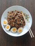 Единственное, что тут делалось долго, это я долго обжаривал со всех сторон купаты, потому что, ну, блядь, мясо нужно приготовить долго. А вот соба, она варится буквально моментально пару минут. Овощи я обжаривал на самой большой мощности 3500 у себя на плите. обжаривал буквально минуту, там добавил соевого соуса, рыбного соуса, овощи, что тут, имбирь, лук и, собственно, перец. Я бы ещё бахнул туда кимчи, но кимчи у меня кончился, завтра буду делать новый.
